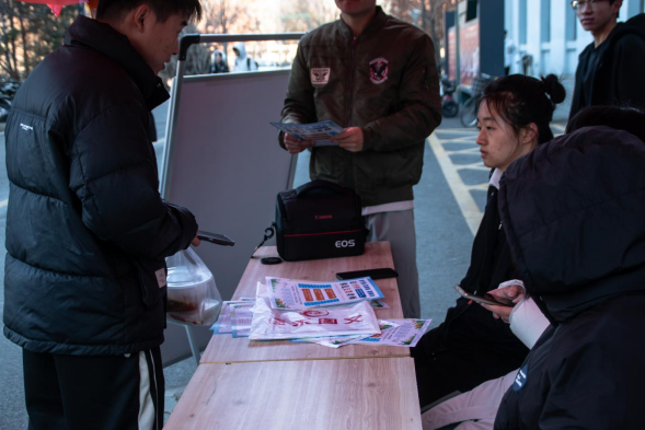 搭建帐篷、摆放桌椅、整理工具……每一位志愿者亲力亲为,为活动开展做足前期准备。志愿者们不惧寒冷,热情向同学们宣传活动,同学们参加活动的热情大大提高。
